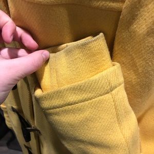 This yellow coat is super warm with quilted lining and a hood. It has zipper and toggle closure. In great used condition with minor discoloration around the cuffs. Flexible on price!