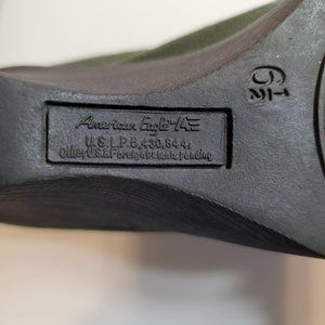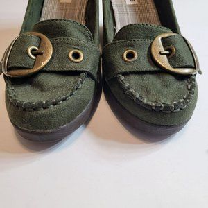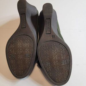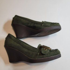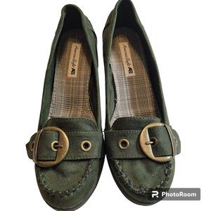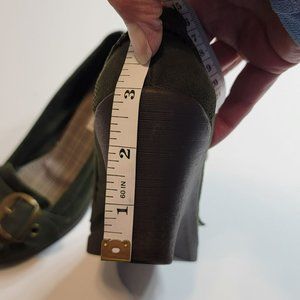 American Eagle Wedge Shoes, Women 6.5, Green Suede w/Buckle, 3" Wedge, EUC