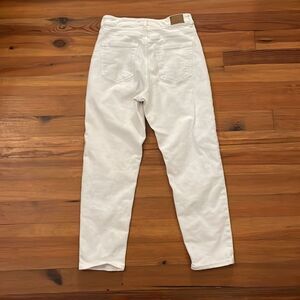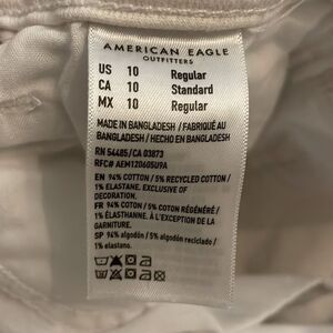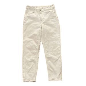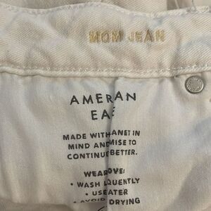White, 94% cotton, 5% recycled cotton, 1% elastane, denim, Mom Jeans by American Eagle in a women's size 10. Front button and zip fly closures. 5-pocket design. High waisted, tapered, ankle slimming pants. Machine washable. Approximate measurements shown in photos. In great pre-owned condition and may have minor signs of wear from normal use. casual, summer, stretch, denim, high rise