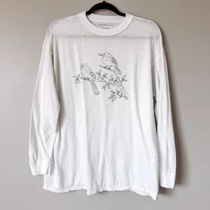 American Eagle White Long Sleeve Graphic Tee Size XS 🧵 Details: Good gently worn condition, long sleeve, round neckline, soft stretchy material, cute bird print on the front, comfortable, a bit oversized in fit 🎨 Color: White and grey 🧵 Material: No care tag is attached 🧼 Care: Machine wash cold, lay flat to dry 📏 Measurements (approx): • Shoulder to hem: 26" • Pit to pit: 21" • Sleeve length: 30" 💫 Bundle 2+ items for 10% off! 💌 Offers welcome 🏡 Ships fast from a clean, smoke-free home