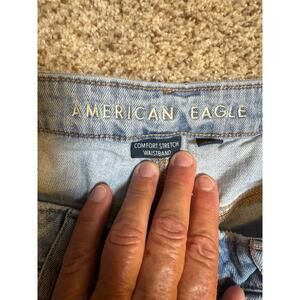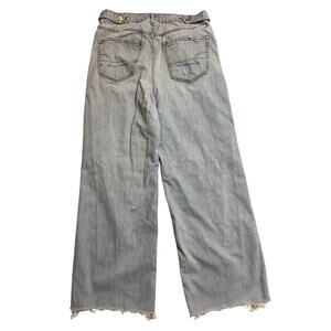 American Eagle Woman's Jeans/Pants size 8, Wide Leg; Baggy; Light Wash. Adjustable Comfort Stretch Waistband; snaps in back to make looser or tighter around waist.
