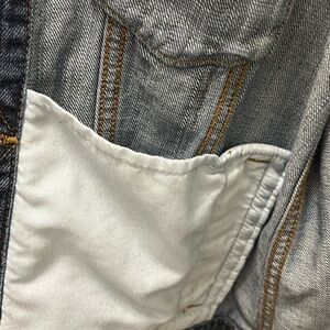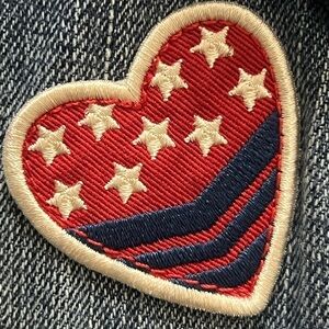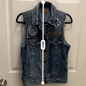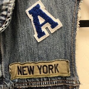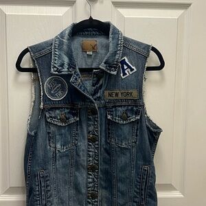 This is a pre-owned denim vest from American Eagle. It features a cool, distressed look with several patches adding to its unique style. The patches include: