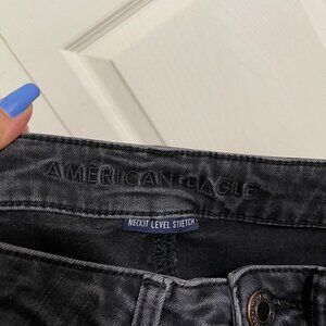 American Eagle Womens Black Wash Distressed Raw Hem Hi-Rise Jegging Jeans Sz 2P. Measurements Waist: 26" Inseam: 25" Rise: 9" Offers always welcome! Measurements are approximations taken while hanging