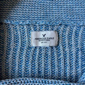 American Eagle Women's Blue and White Knit Cropped Front Button Cardigan - Medium.