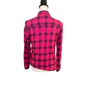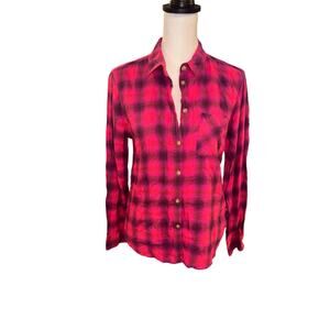 Gently Used in excellent condition American Eagle Women's button-down top. Size Medium Pink and Purple 73% Viscose, 27% Cotton.