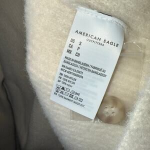 American Eagle Women's Button Up Cardigan, in gently used condition, color is cream with brown buttons similar to photos, made of nylon, size small womens (in my opinion more of a relaxed, not tight fit)