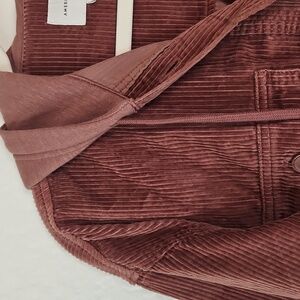Trendy and cozy American Eagle women’s bomber-style jacket in soft corduroy fabric with an attached hoodie. Features a rust brown color, button front, flap chest pockets, and a slightly cropped, boxy fit. Perfect for layering with your favorite fall and winter outfits 🍁✨