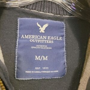 Fitted gray striped quarter zip up mock neck sweater by American Eagle Outfitters, size medium. 100% cotton. Listed as women's, but unisex. Please check measurements below for fit. Excellent pre-owned condition; no flaws.