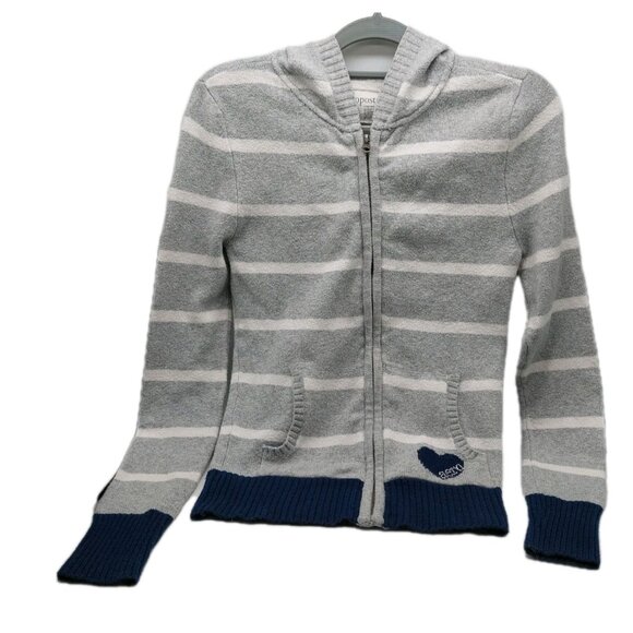 American Eagle Women's Hoodie Sweater Size XL Striped Gray Cream V Neck Zipper