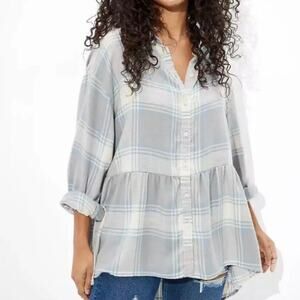 American Eagle Womens Oversize Plaid Baby Doll Button Down Shirt Medium Gray