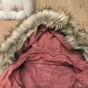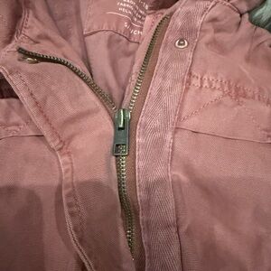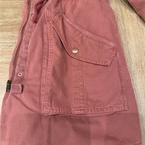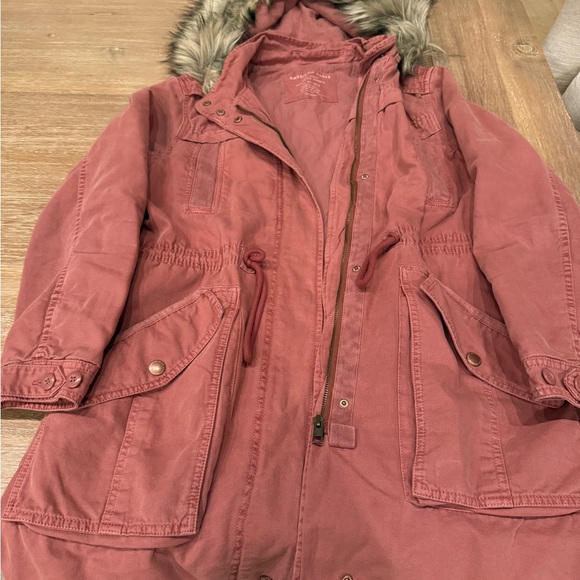 Stylish utility jacket with faux fur hood. Features multiple pockets and drawstring waist.