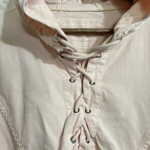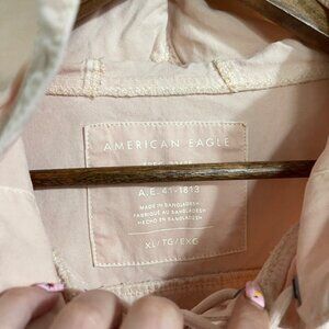 American Eagle Womens Pink Lace Up Neck Hooded Raw Hem Zipper Pockets Jacket XL. Measurements Shoulder to shoulder: 22" Underarm to underarm: 25" Length: 23" Sleeve: 21" Offers always welcome! Measurements are approximations taken while hanging