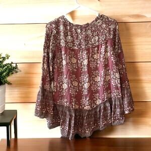 American Eagle women’s size small blouse in rose pink sheer fabric with a floral boho print. This lightweight top features flowy bell sleeves and a relaxed fit, perfect for layering over camisoles or bralettes. Ideal for casual wear, festivals, or date nights, it pairs easily with jeans, shorts, or skirts. A feminine, boho-inspired blouse with American Eagle’s carefree style.