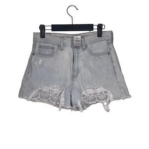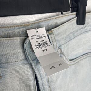 American Eagle Womens Bottoms Size 2 Light Wash Denim Jean Blue The Mom Short. NWT. High waisted, high rise. Lace, crochet lining. Distressed. Side pockets. Cut off shorts. Cotton. Elevate your casual style with these women's denim shorts from American Eagle Outfitters. The light wash denim fabric and solid pattern make these shorts perfect for summer and spring seasons. The shorts feature a flat front with a high rise waist of 28 inches, and a zip closure for a comfortable fit. These Mom shorts also have pockets and are made of cotton fabric, making them durable for everyday wear. They are available in size 2 and are perfect for a casual occasion. Add these stylish denim shorts to your wardrobe for a comfortable and fashionable look.