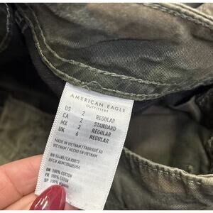 The product is a pair of American Eagle Women's Size 2 Regular Camouflage Baggy Cargo Pants in a military green color. These pants feature a zip and button closure, making them suitable for travel and casual occasions. Made from cotton twill fabric, they provide comfort and are easy to care for. The cargo style with straight legs and multiple pockets adds practicality to the design. Perfect for all seasons, these pants are a versatile addition to any woman's wardrobe.