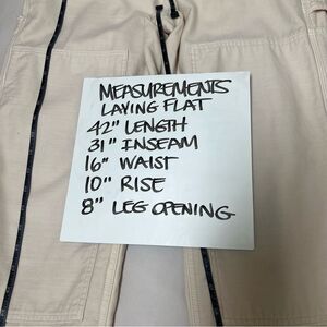 Featuring zipper and embossed button closure with two front pockets and two back pockets wtih embossed AE. Plus two lower cargo pockets and a “hammer” loop. Brown leather American Eagle patch.