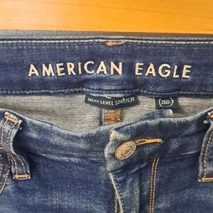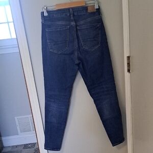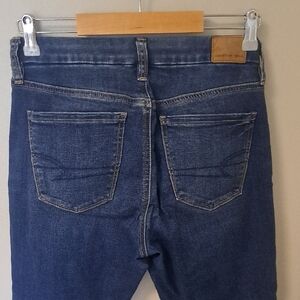 Classic American Eagle skinny jeans in a dark blue wash with subtle fading for a flattering, versatile look. Soft, stretch denim for all-day comfort. Perfect for casual wear year-round.