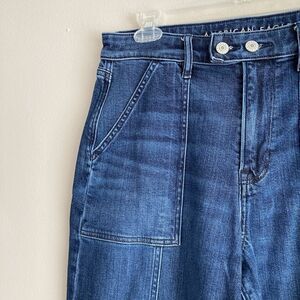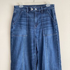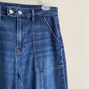 American Eagle Womens Super Hi Rise Baggy Wide Leg Jeans Size 10 LONG Med Wash. American Eagle womens super high-rise baggy wide leg jeans. Zipper and double button closure. Front pockets and back pockets. Wide leg. Medium wash. Size 10 LONG. Measured laying flat: 14.75 inches at waist, 11.75 inch rise, 31.25 inch inseam.