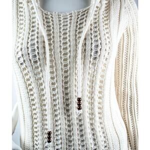 American Eagle Womens Sweater Large Cream Hooded Open Cable Knit Crochet Hoodie
