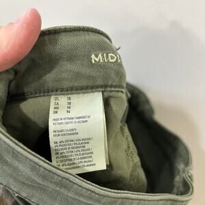 American Eagle Women's Sz 10 Green Mid Rise Midi Twill Jean Shorts Super Stretch. 48% cotton, 43% viscose, 6% polyester and 3% spandex. The waist measures 31 inches, the rise is 9 inches and the inseam is 5.5 inches. In excellent condition.