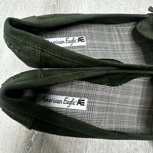 These American Eagle Women's Y2K Wedge Loafers in size 11 are a stylish and trendy addition to any wardrobe. Featuring a green color and a faux suede upper material, these preppy-themed shoes provide a comfortable platform heel style that is perfect for adding a touch of sophistication to any outfit. The wedge design offers both style and practicality, making them a versatile option for various occasions. Perfect for those looking to make a statement with their footwear while staying true to a classic preppy aesthetic.
