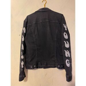 Distressed American Eagle X Rapper Young Money Collab Jean jacket sz Large NEXT LEVEL FLEX across chest 23”