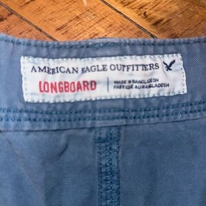 American Eagle blue, relaxed, surfer, longboard shorts. Pairs well with a basic tee or button down shirt. Approximately 23 inches across the waist, 14 inch rise, 11 inch inseam. From a pet and smoke free house. Happy to bundle!