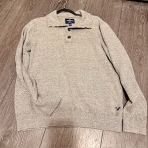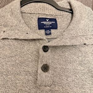 This is a gently used American Eagle 100% cotton grey s/p long sleeve sweater with button neck collar, ribbed cuffs, neckline and waistband. American Eagle insignia embroidered on the bottom. Super soft and in very good condition. Size Large and measures 21" pit to pit(unstretched) and 26" shoulder to hem. #mensamericaneagleclothing #americaneaglesweater #menslargesweater #menscottonsweater