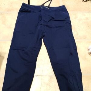 These are a pair of navy stretch waist pants with tie in front. They have the two side pockets in the front and they have two pockets in the back one with a button and one with just the slit. I love the bottom of these with the elastic bands looks great with a pair of nice white sneakers. size medium lying flat the measurements are approximately waste 17 to 18 in Inseam is 28". Great condition!!