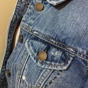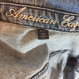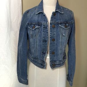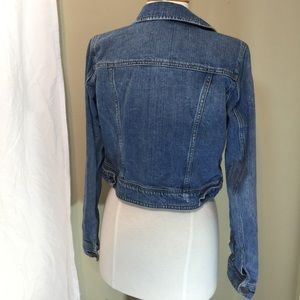 American Eagle brand denim jacket in size medium. This is a stylish and modern length. Sleeves measure from shoulder 25 inches. Overall length from shoulder seam is 18 inches. Laying flat, jacket measures across 17 1/2 inches.