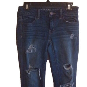Nice distressed style American Eagle jeans. Some of distressing might not have been done at factory, but nicely done. ( pocket in back too?) Soft jeans for school. Size 4.Good used condition.