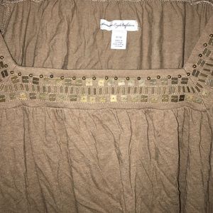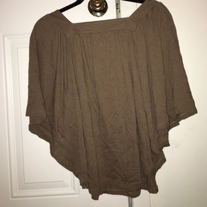 This is a brown tee from American Eagle in a size medium. It has very wide sleeves that have a seam attached to the full sides of the shirt. I've provided some close up photos with the sleeve pulled up so you can see 😊 there's also a gorgeous sequin and bead detail along the top. Love!