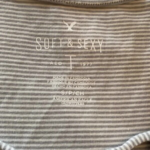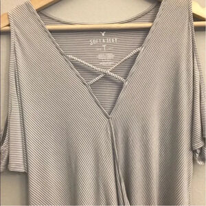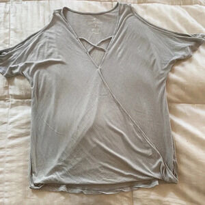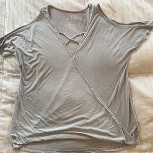 This is a size small American Eagle soft and sexy cold shoulder gray and white top. Crisscross material in front.