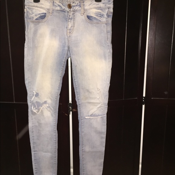 Jegging super stretch skinny jeans. Size 4. Light wash, distressed with holes.