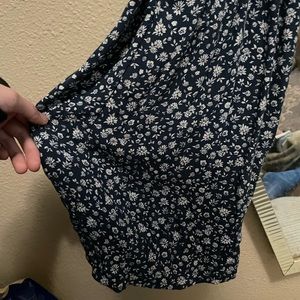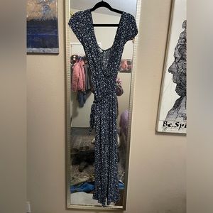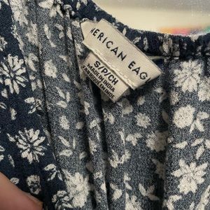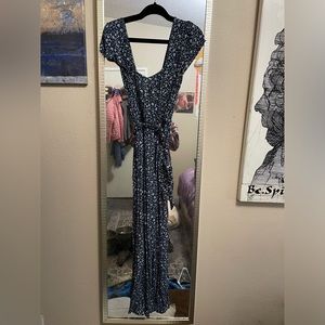 American Eagle cal sleeve low back navy blue with tiny white flowers. Very pretty Deep V-neck that has a hook for desired cut with the matching tie belt. Great pre-owned condition only ever cold washed and hung dry.