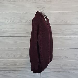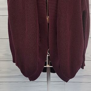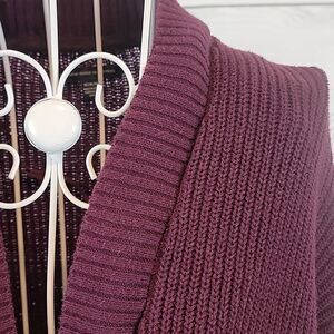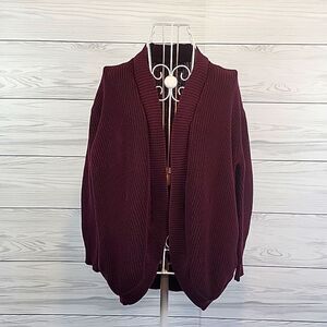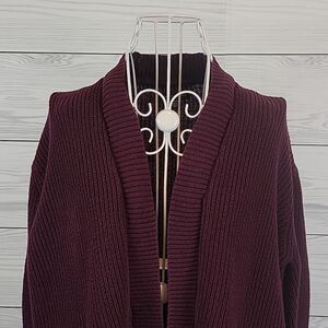 Flattery cocoon cut cardigan by American Eagle Outfitters with a shawl trim, long sleeves, and ribbed knit cuffs and hemline. Good pre-owned condition with normal signs of wash and wear. I'm going to mark the color as purple, but it's more of a maroon.