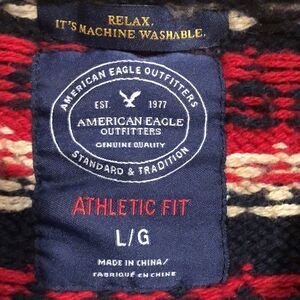 American Eagle outfitters men’s heavy Athletic fit sweater size large.Great sweater on a cold night .It soft and comfortable.60% cotton 35%nylon 5%rabbit hair.