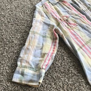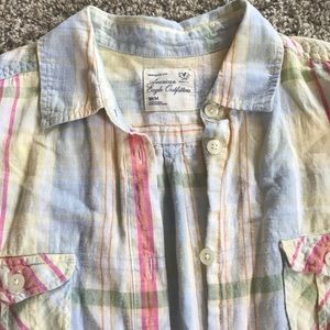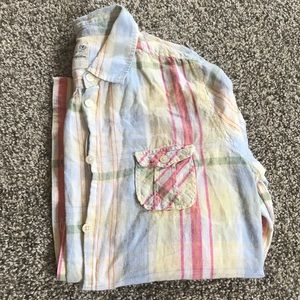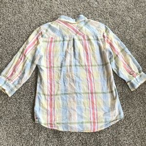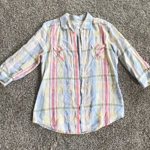 This plaid button up has a cute pastel color scheme and has 3/4 length sleeves! Great condition!