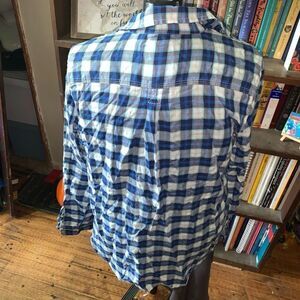 American Eagle tartan, plaid, blue, lightweight, relaxed, boyfriend fit, button down shirt. Approximately 21 inches from armpit to armpit, 28 inches long. In good, used condition. From a pet and smoke free home.