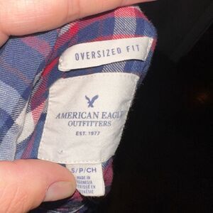 American Eagle red and blue, plaid, festival, Americana, button down shirt. Pairs well with a cami and shorts or jeans. Cute over a dress. Approximately 18 inches from armpit to armpit, 25 inches long. In good, used condition. From a pet and smoke free house.