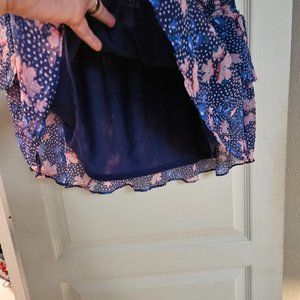 Cute ruffle bum mini skirt. Love the feminine pattern in lavender blue and white polka dot! Hits just under bum and is so sexy and sweet. In New condition, size large.