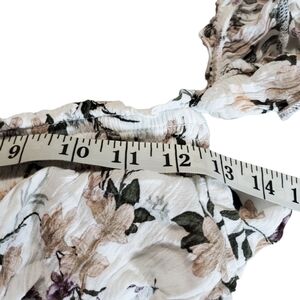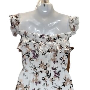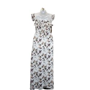 Off shoulder floral maxi dress, shorter in front, lined to mini length. In great condition and measurements shown.