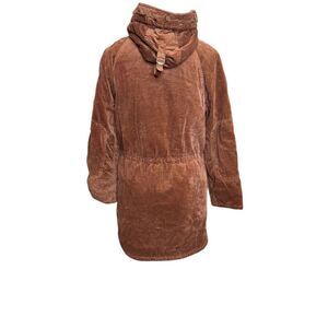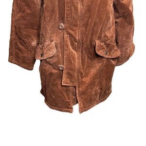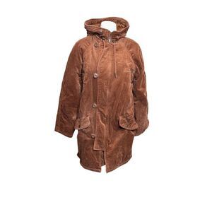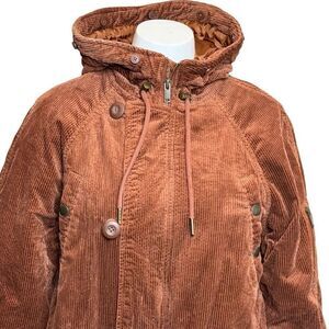 American Eagle rust corduroy hooded knee length jacket size XS. Fur for the hood is missing. Inner waist cinching tie. Full zip and loop button closure. Knee length. Good condition. Shell 100% cotton. Lining 100% polyester. Length 34” Chest 19.5”.