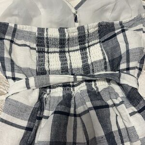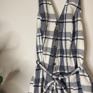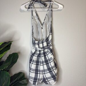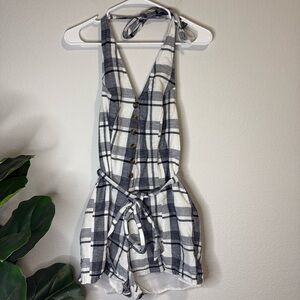 American eagle size small halter romper. Buttons on top are decorative and not functional. Fully lined. Belted waist and adjustable tie halter top. Smocked back.