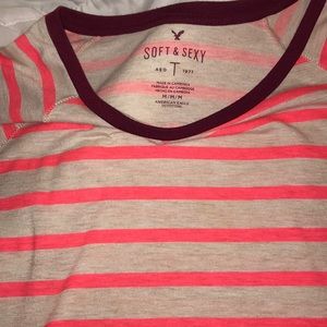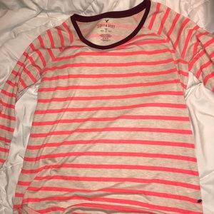 Pink and tan striped tee with a maroon band around the neck area. Size medium. Only worn once!