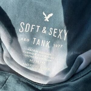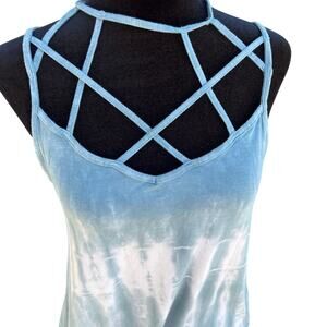 Front and back of neck area has crisscross straps. Tie-dye teal and white.