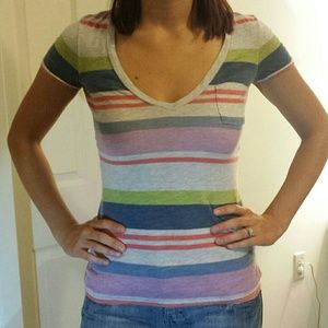 Multicolored striped t-shirt with orange AE logo on bottom corner. V-neck, front pocket. Tight fitting. Tiny hole at the top center.