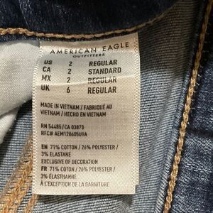 American Eagle super stretch, skinny jeans women’s size 2 dark wash denim. Classic pair of American Eagle super stretch, skinny jeans and a flattering dark wash women’s size 2, midrise fit, super soft and stretchy for comfort and shape retention, gently worn, excellent conditions with no stains or holes, perfect every day denim – pairs great with boots, sneakers, or flats. Inseam 27 inches see picture. 71% cotton 21% polyester 3% elastane. From smoke free home. Fast shipping.