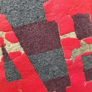 Condition: Good. Pilling. Spots on front upper right sleeve & back right sleeve cuff. Cracking in screenprint -- intentional?