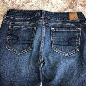 American Eagle Artist Womens Sz 2 (30”x23”)Stretch Blue Distressed Cropped Jeans. Condition is Pre-owned. Shipped with USPS Priority Mail.